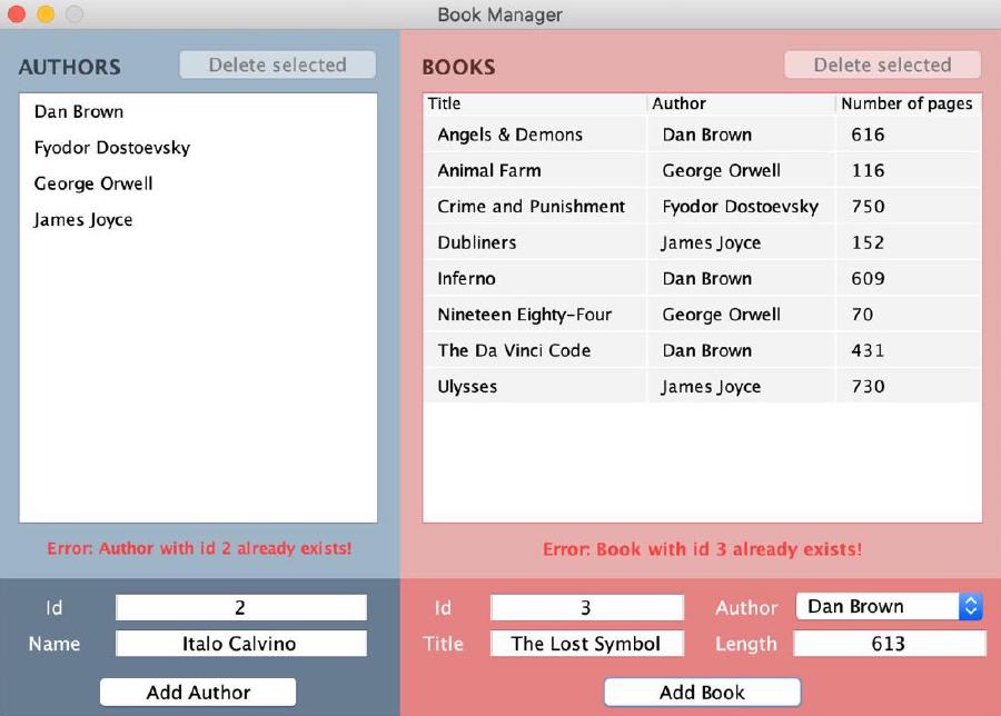 - Deleting an existing author or a book through the user interface results in the item being deleted from the corresponding list or table