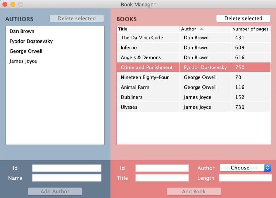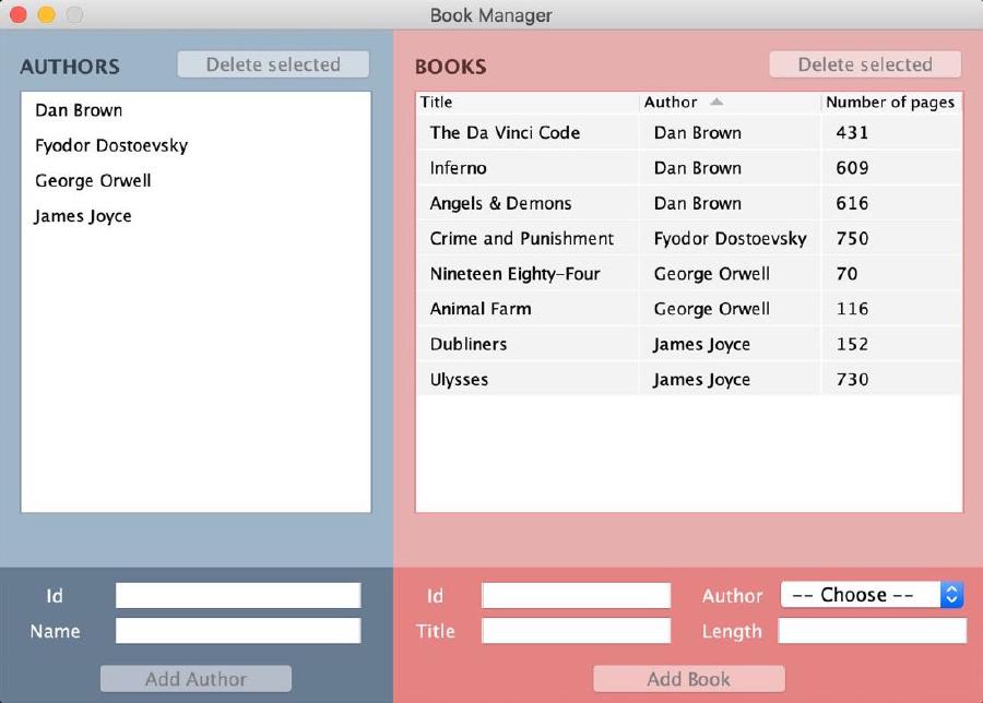 BookandAuthor), because they have no logic inside them (and methods such asequals,hashCodeandtoStringhave been generated automatically by the IDE) TextFieldDocumentListener, a custom Swing component, because it contains a method that is required by theDocumentListenerinterface but is never actually called throughout the appBookManagerSwingAppbecause it’s the main class that contains the method to run the application