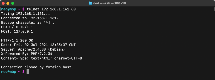 The webserver was found to be running an Apache/2.4.38 web server on port 80 and powered by PHP 7.2.34. This information was obtained using banner grabbing techniques, in particular by using the telnet TCP protocol to request page headers through the HEAD HTTP method: