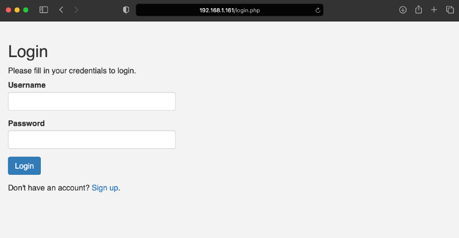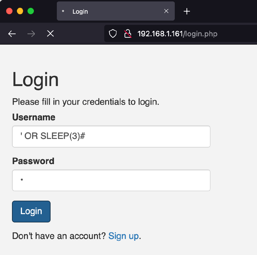Using a sleep SQL command as the username and any non-empty string as password results in the web page halting for 3 seconds.