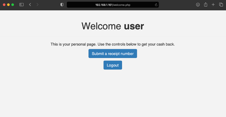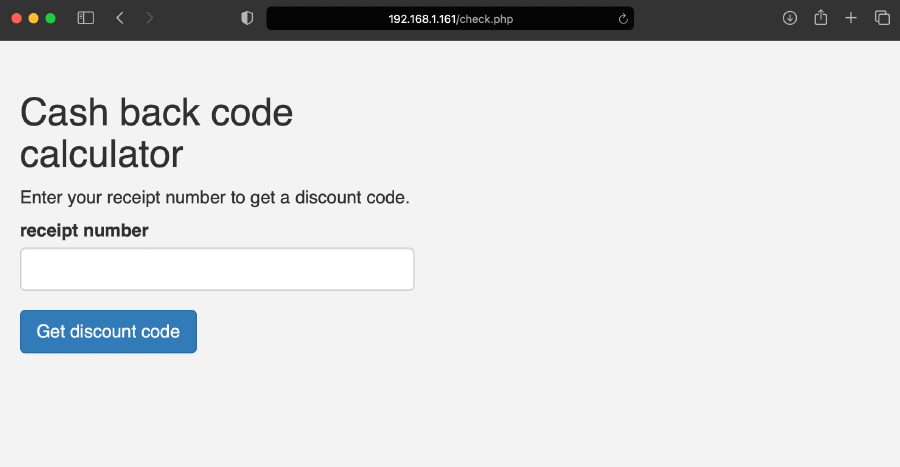 192.168.1.161/welcome.php - A page to generate discount codes, login protected, showing an input field