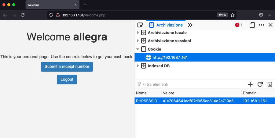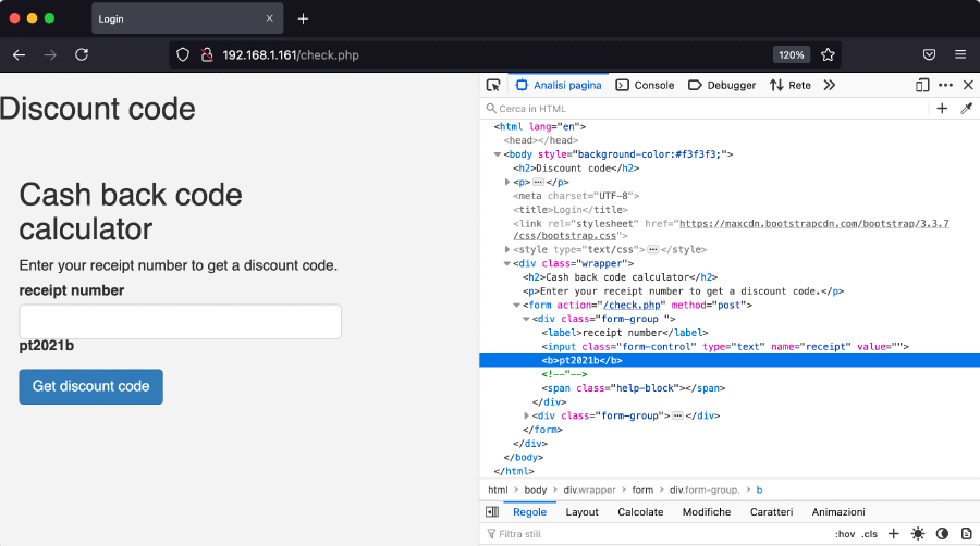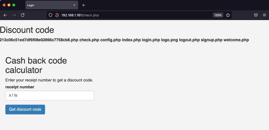 In particular, the discount page was found to be vulnerable to a highly dangerous remote code injection vulnerability, which was used to obtain interactive access to the underlying operating system and dump all the database information, containing ids, usernames and passwords. The ids and passwords were hashed, but it was relatively easy to retrieve them in plain text since they were all very weak.