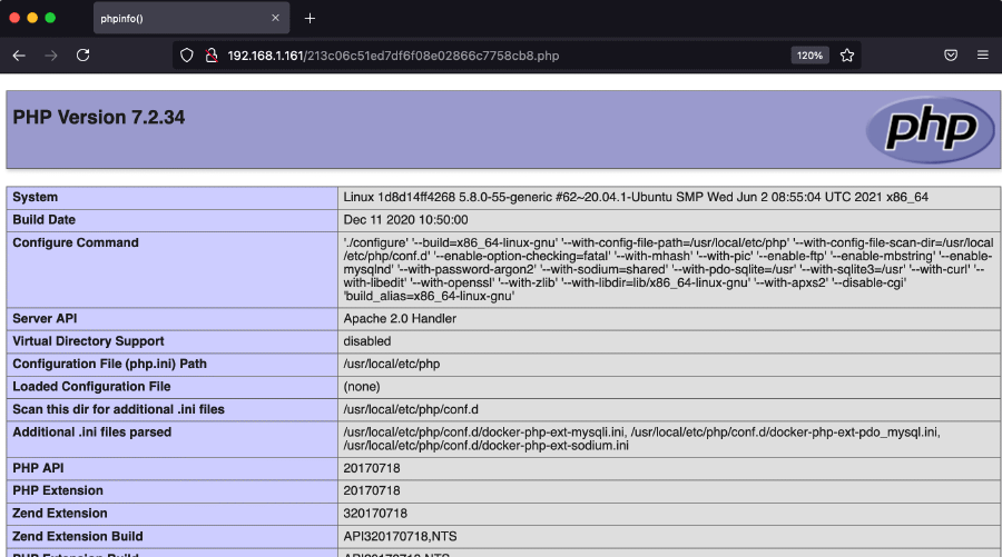ls commandThis reveals some sort of secret file named 213c06c51ed7df6f08e02866c7758cb8.php which appears to be the PHPinfo page, disclosing a large amount of information (PHP version, server information, configuration settings, environment variables…). For example, we now know that MySQL version is 5.0.12.
