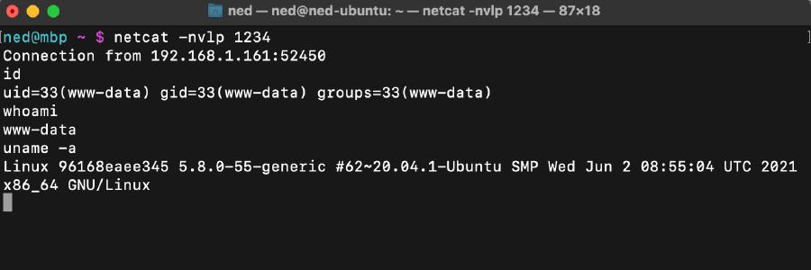 - Wait until the connection is established, and then issue commands on the target host from the attacker host:
