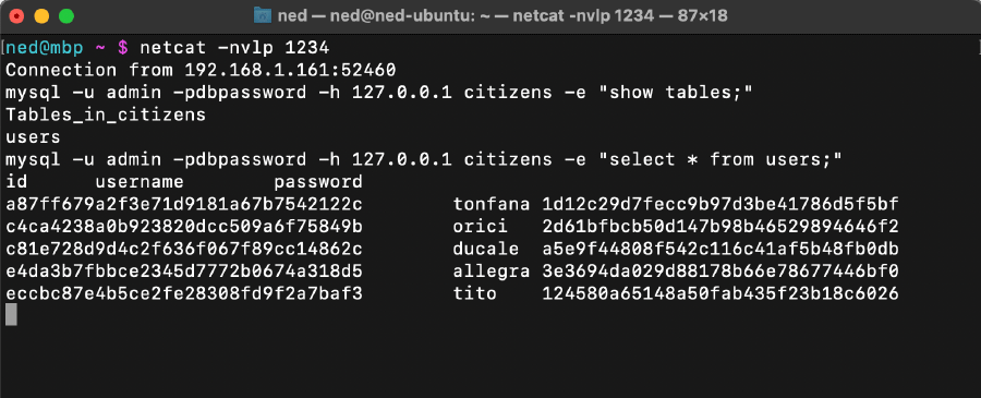 mysql -u admin -pdbpassword -h 127.0.0.1 citizens -e "show tables;”to show all tables in database citizensmysql -u admin -pdbpassword -h 127.0.0.1 citizens -e "select * from users;”to enumerate all rows in table users