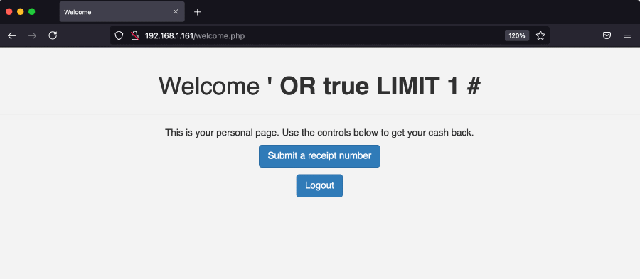 ' OR True LIMIT 1#logs the user in and redirects to the welcome page' OR False LIMIT 1#outputs an error (Username or password incorrect, try again)