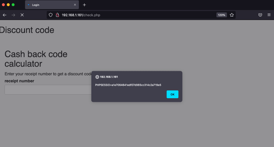 Note that the session identifier could also be obtained by using the previously mentioned XSS vulnerability in the discount page, using a payload such as: