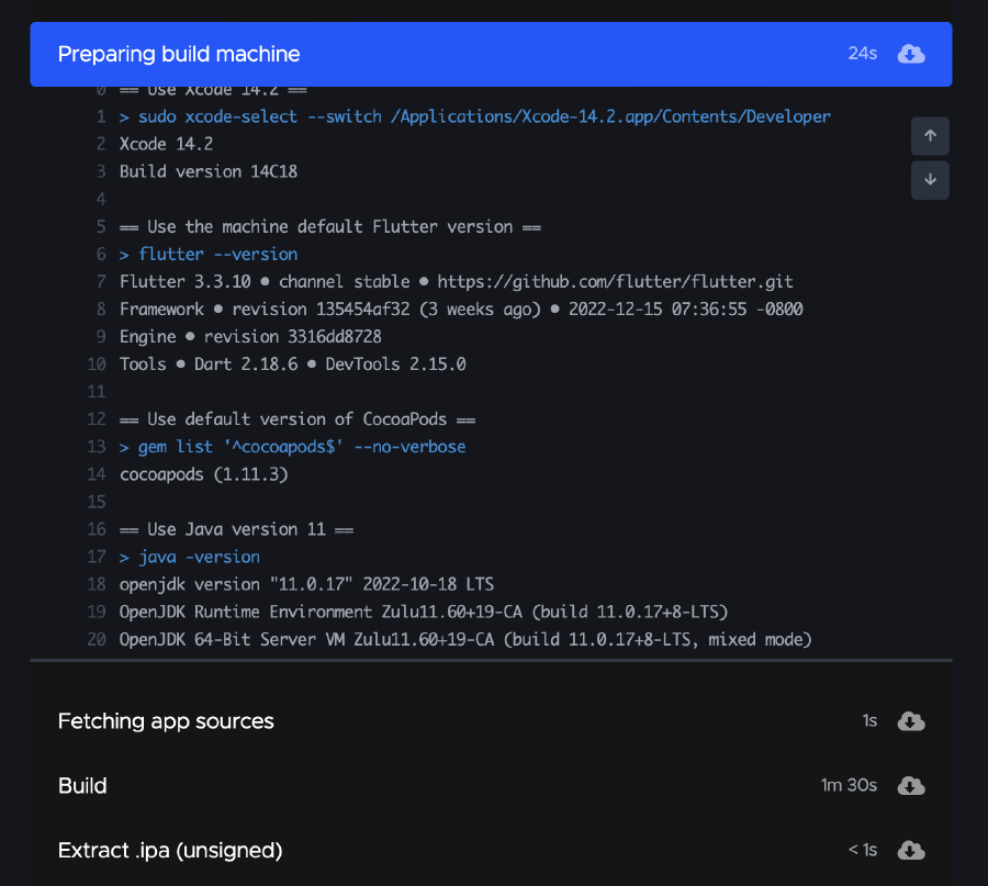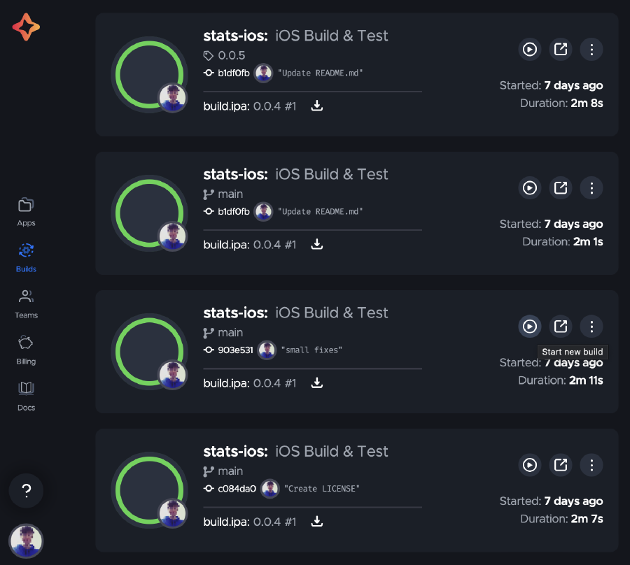 Your app’s builds will show up in the builds page, along with their status and eventual artifacts that can be downloaded. Logs can be viewed for each build to investigate issues.