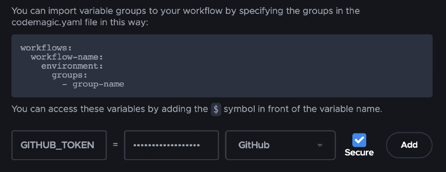 Add your GitHub personal access token to Codemagic’s environment variables (see documentation)3
