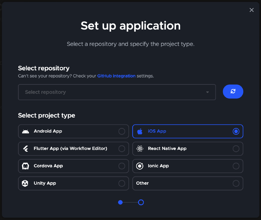 - Select your Git provider (I use GitHub) and your repository. Note that adding repos from GitHub requires authorizing Codemagic and installing the Codemagic CI/CD GitHub App to a GitHub account.1