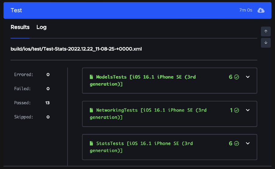 1- name: Automated tests 2 script: | 3 #!/bin/sh 4 set -ex 5 xcode-project run-tests \ 6 --project "Stats.xcodeproj" \ 7 --scheme "Stats" \ 8 --device "iPhone 11" \ 9 --test-xcargs "CODE_SIGNING_ALLOWED=NO"10 test_report: build/ios/test/*.xmlHowever, despite my relatively simple test suite (13 unit tests), I noticed some mixed results on my builds: