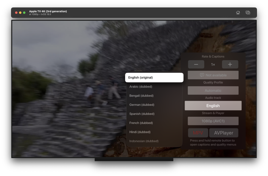 On the UI side, I added an audio track picker in the player controls so the available tracks show up as a normal selection menu during playback.